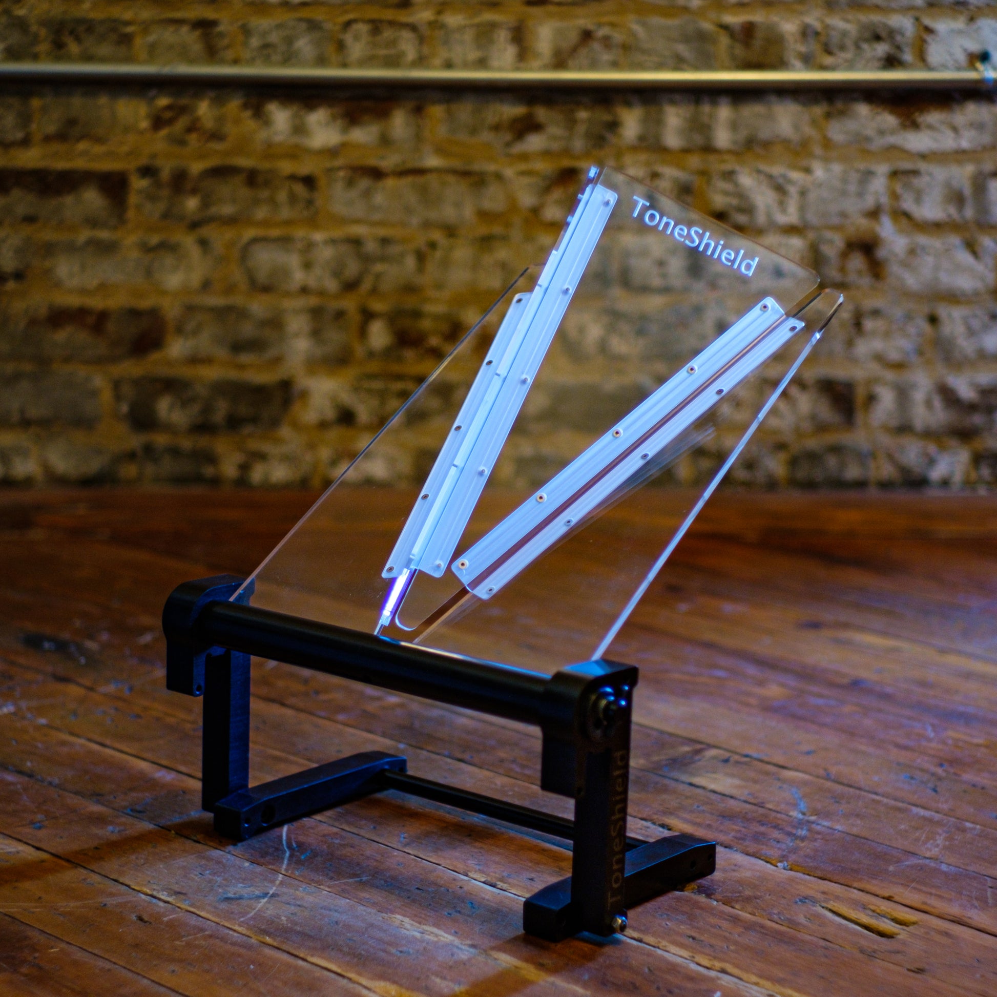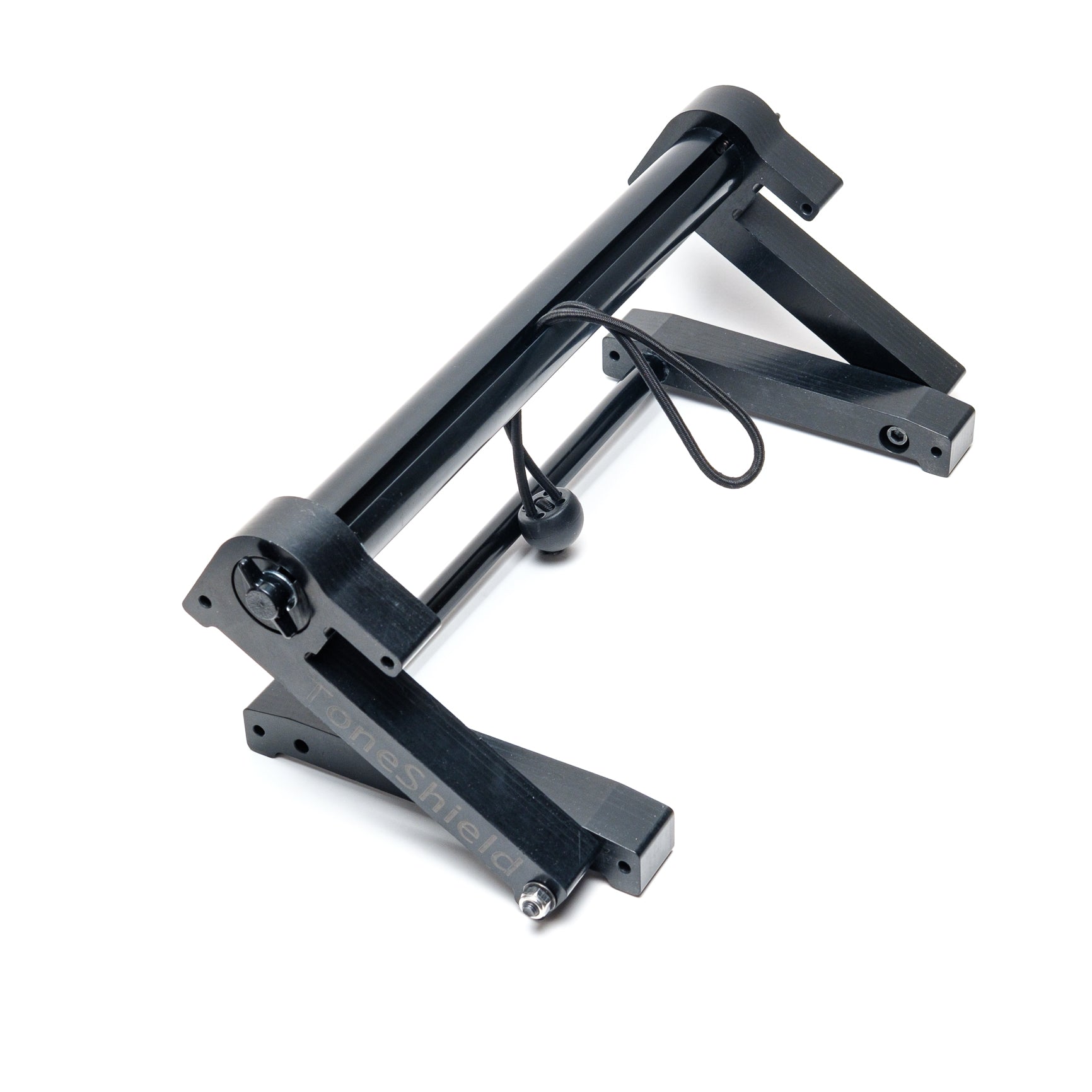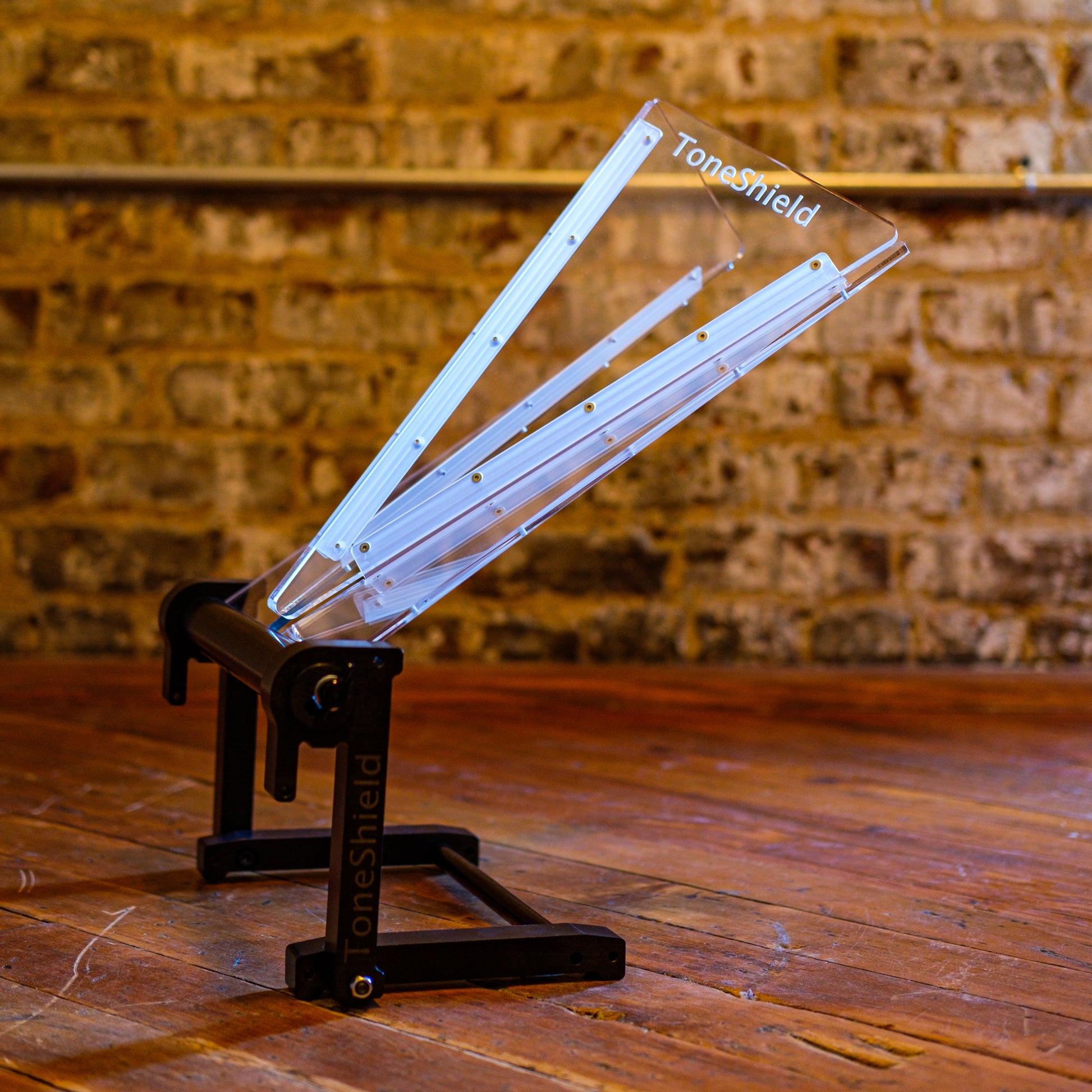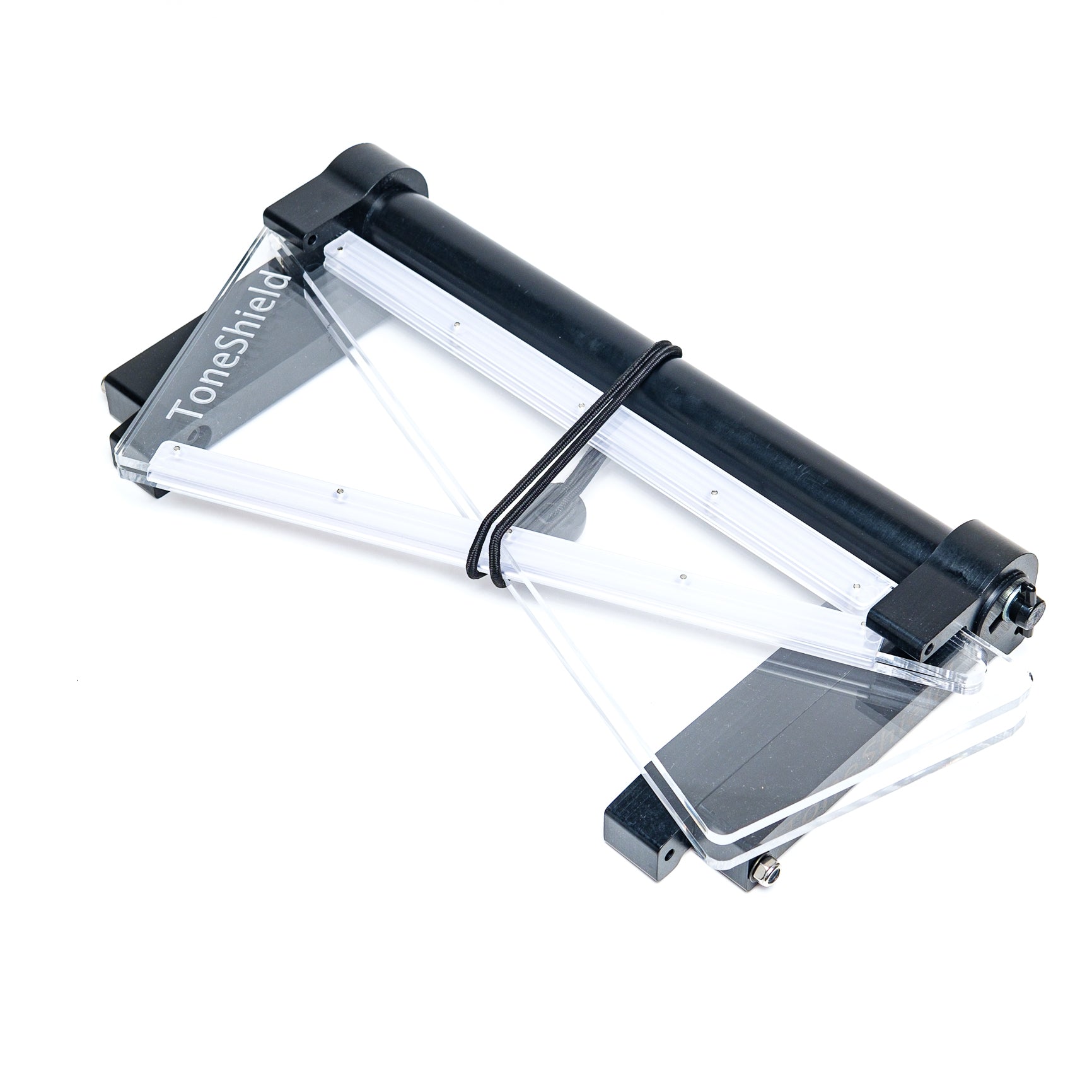 ToneShield v2R including Adjustable Base with unlimited angles and Riser. The Riser will raise the shield up 4" above the lowest position. This adjustable base is lightweight, will adjust to any angle you desire and can be disassembled for compact travel. Manufactured from ABS in Chatham, VA.