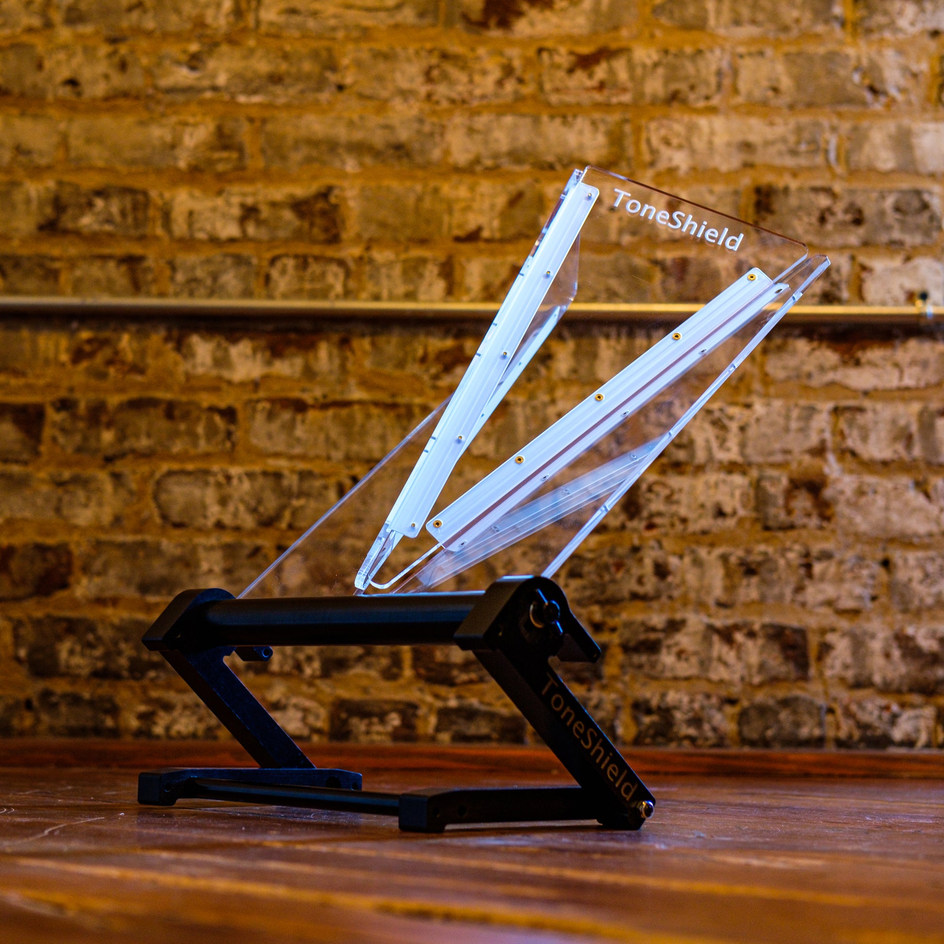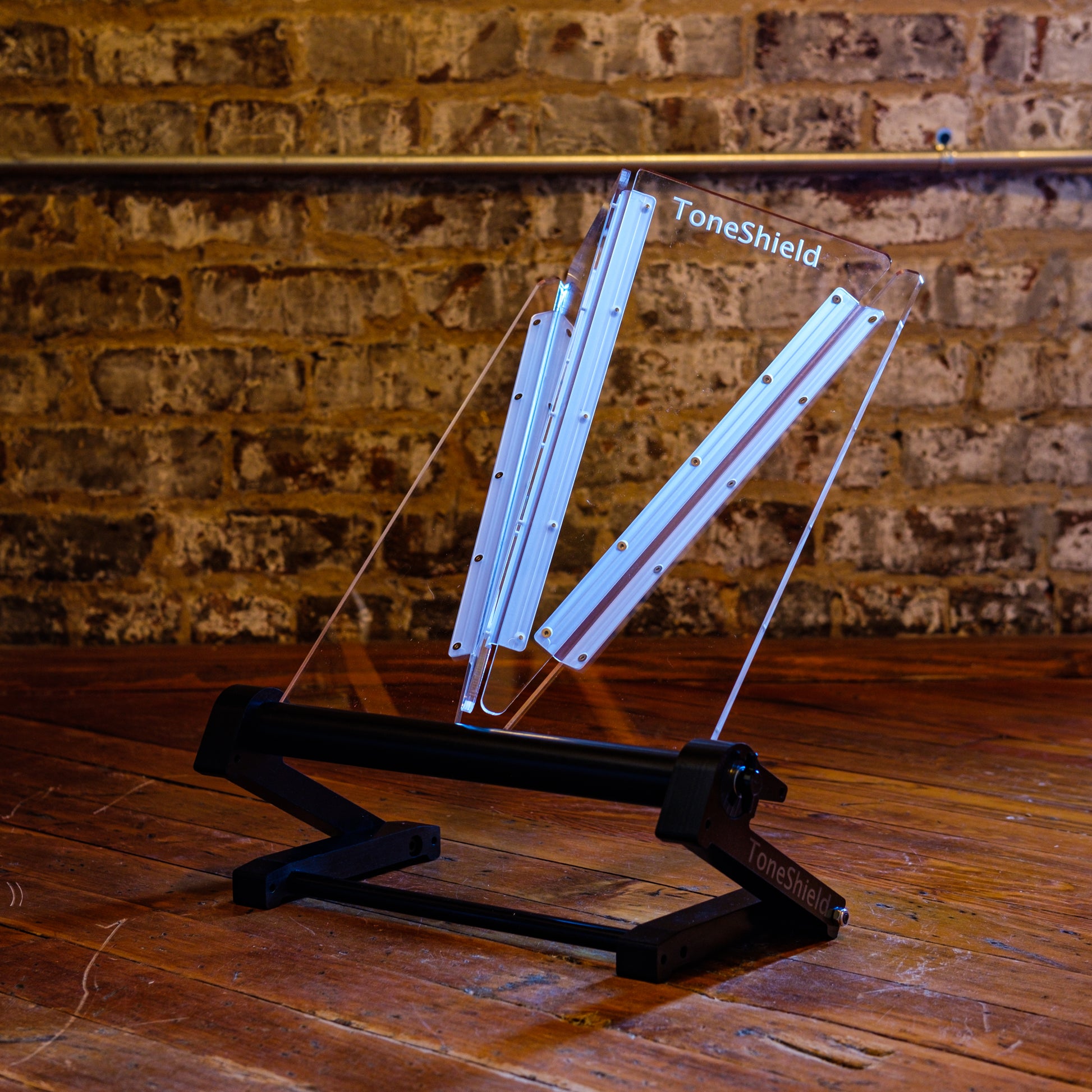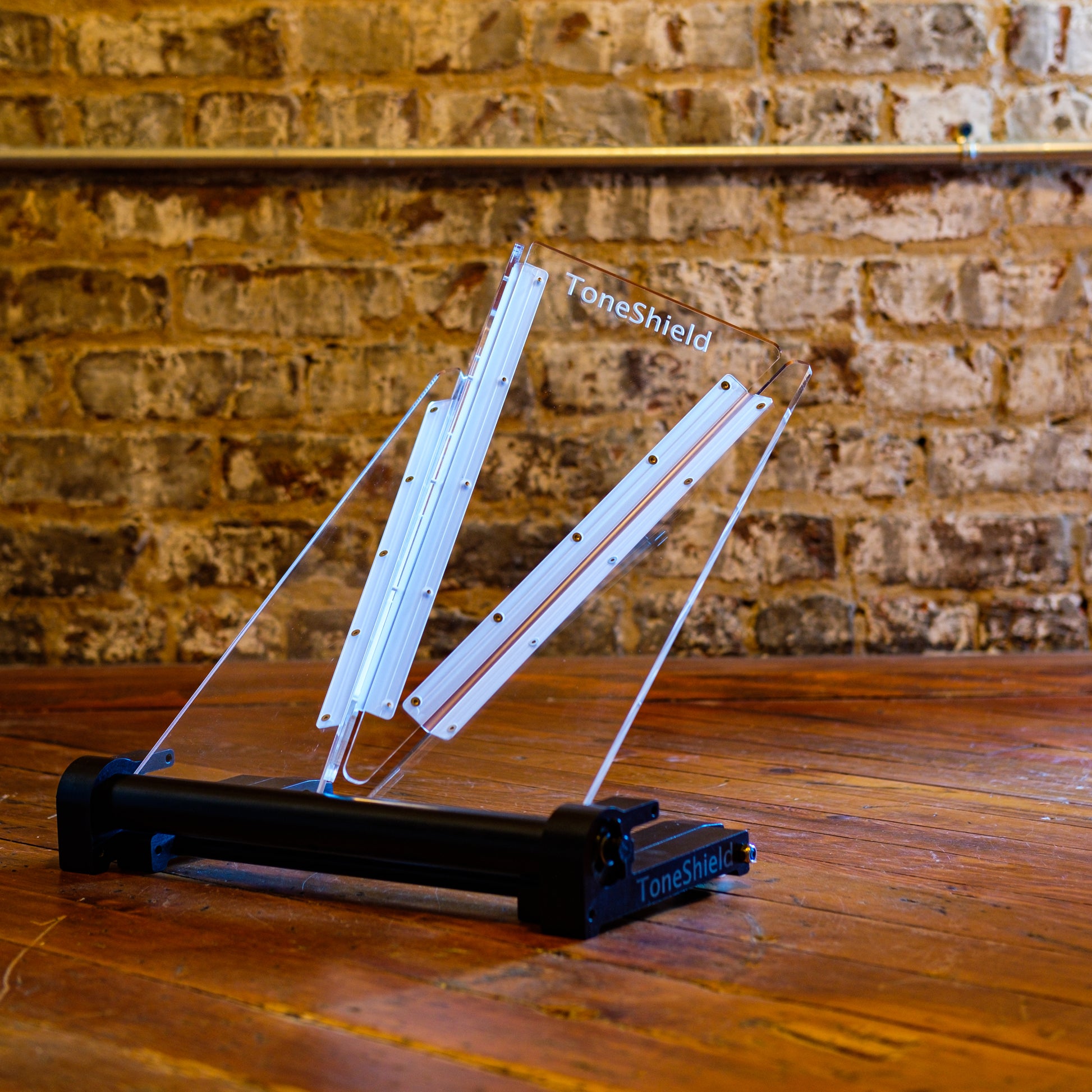ToneShield v2R including Adjustable Base with unlimited angles and Riser. The Riser will raise the shield up 4" above the lowest position. This adjustable base is lightweight, will adjust to any angle you desire and can be disassembled for compact travel. Manufactured from ABS in Chatham, VA.