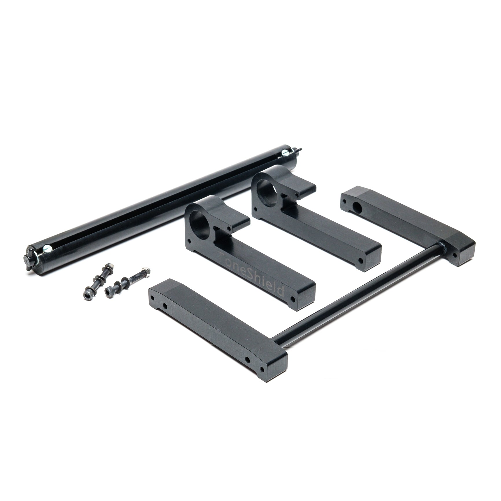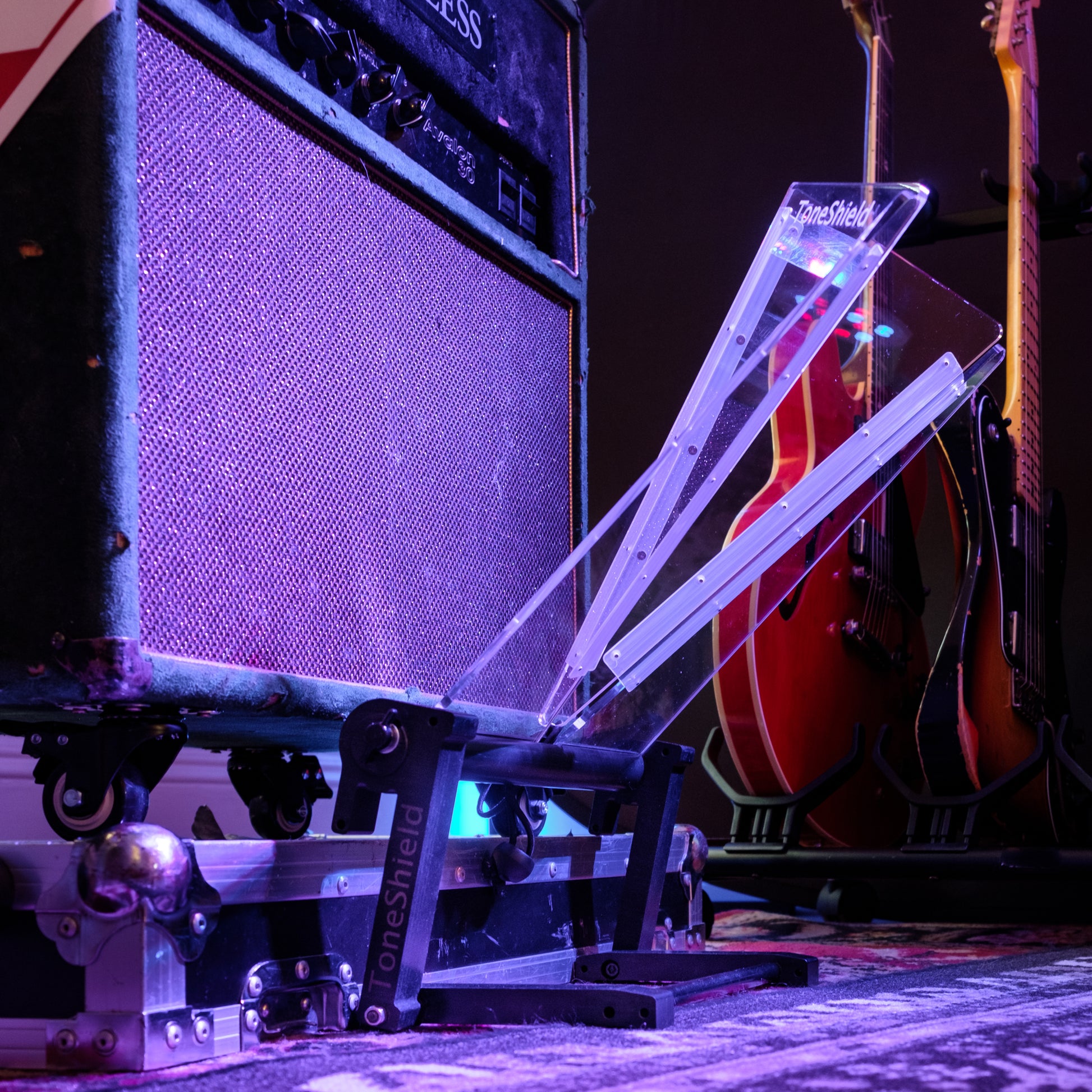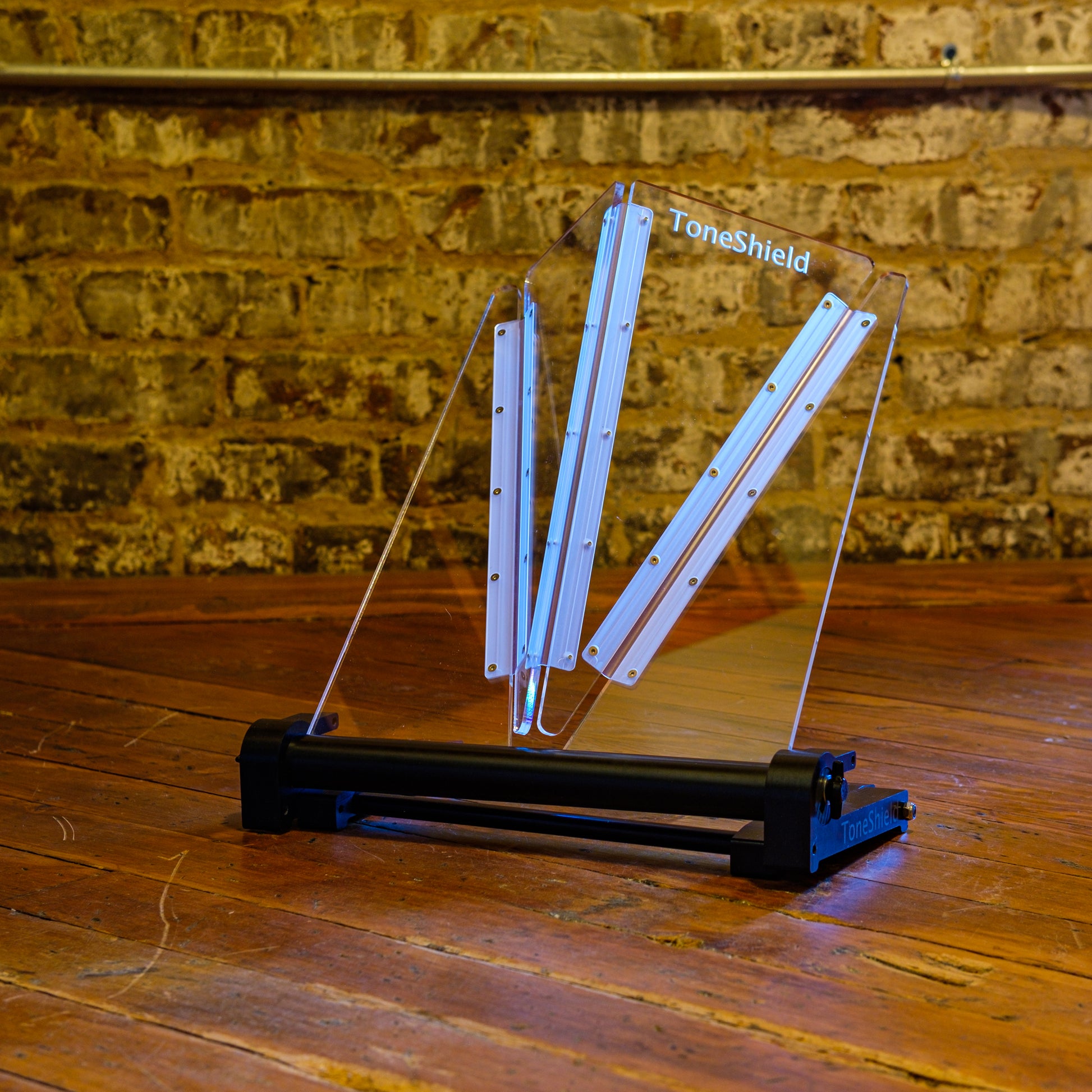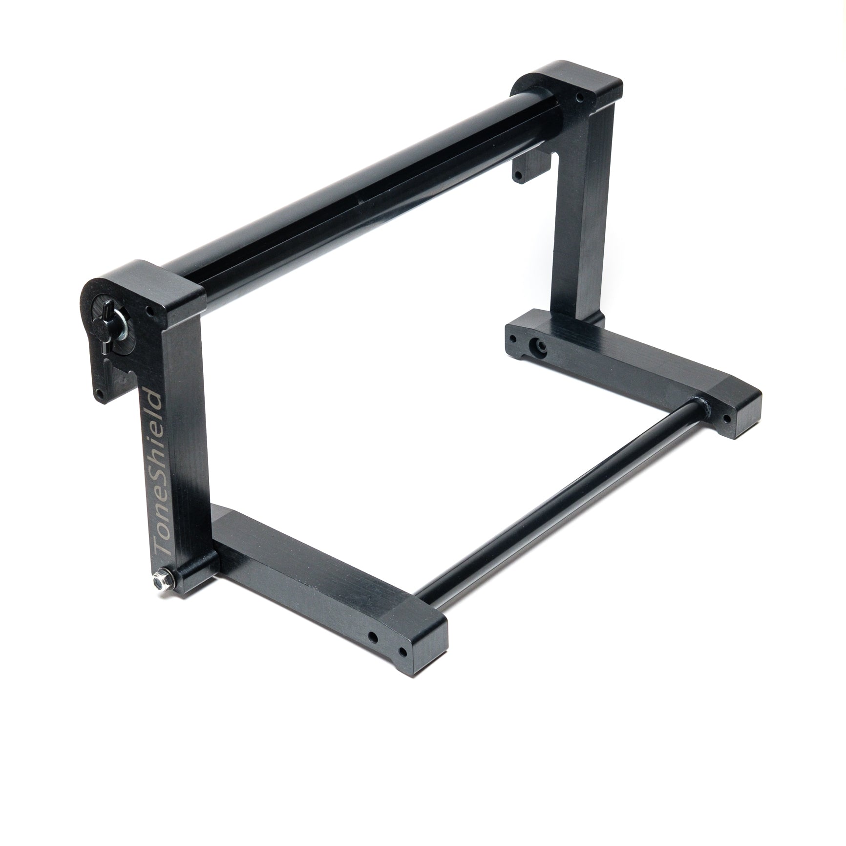 ToneShield v2R including Adjustable Base with unlimited angles and Riser. The Riser will raise the shield up 4" above the lowest position. This adjustable base is lightweight, will adjust to any angle you desire and can be disassembled for compact travel. Manufactured from ABS in Chatham, VA.