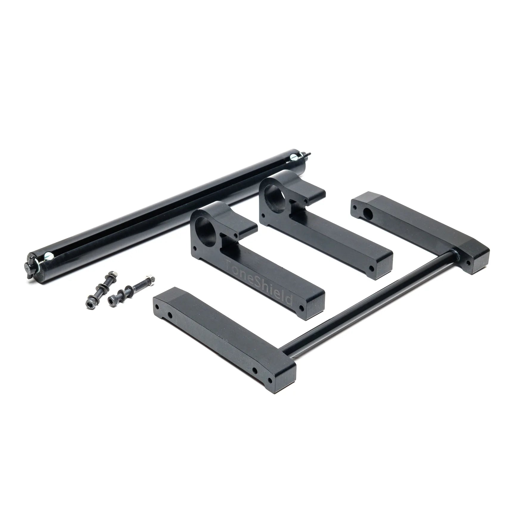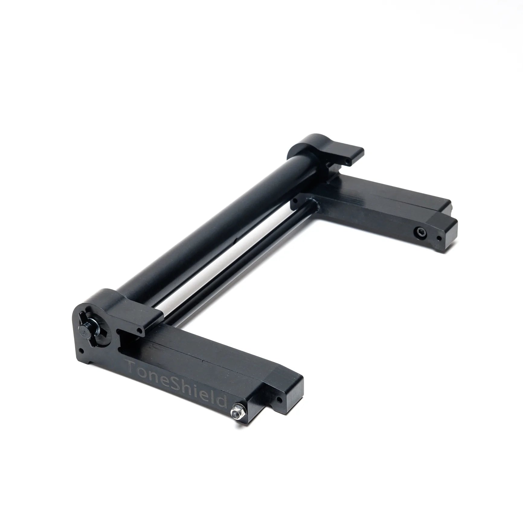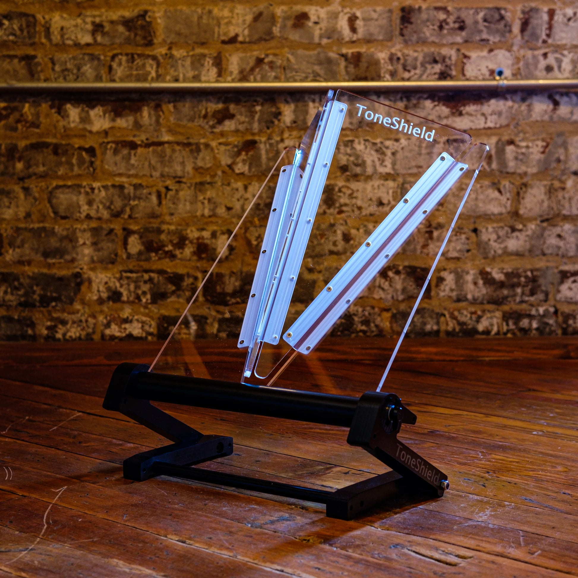 ToneShield v2R Adjustable Base with unlimited angles and Riser. The Riser will raise the shield up 4" above the lowest position. This adjustable base is lightweight, will adjust to any angle you desire and can be disassembled for compact travel. Manufactured from ABS in Chatham, VA.