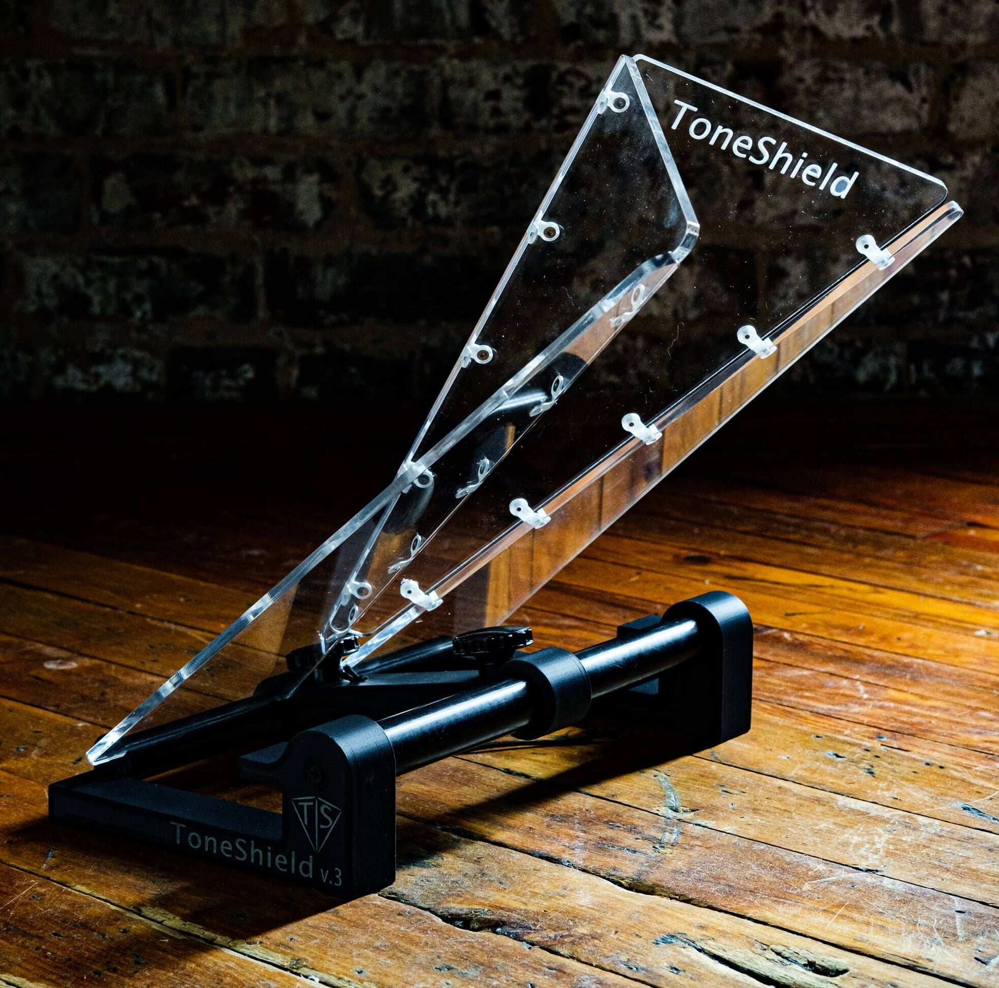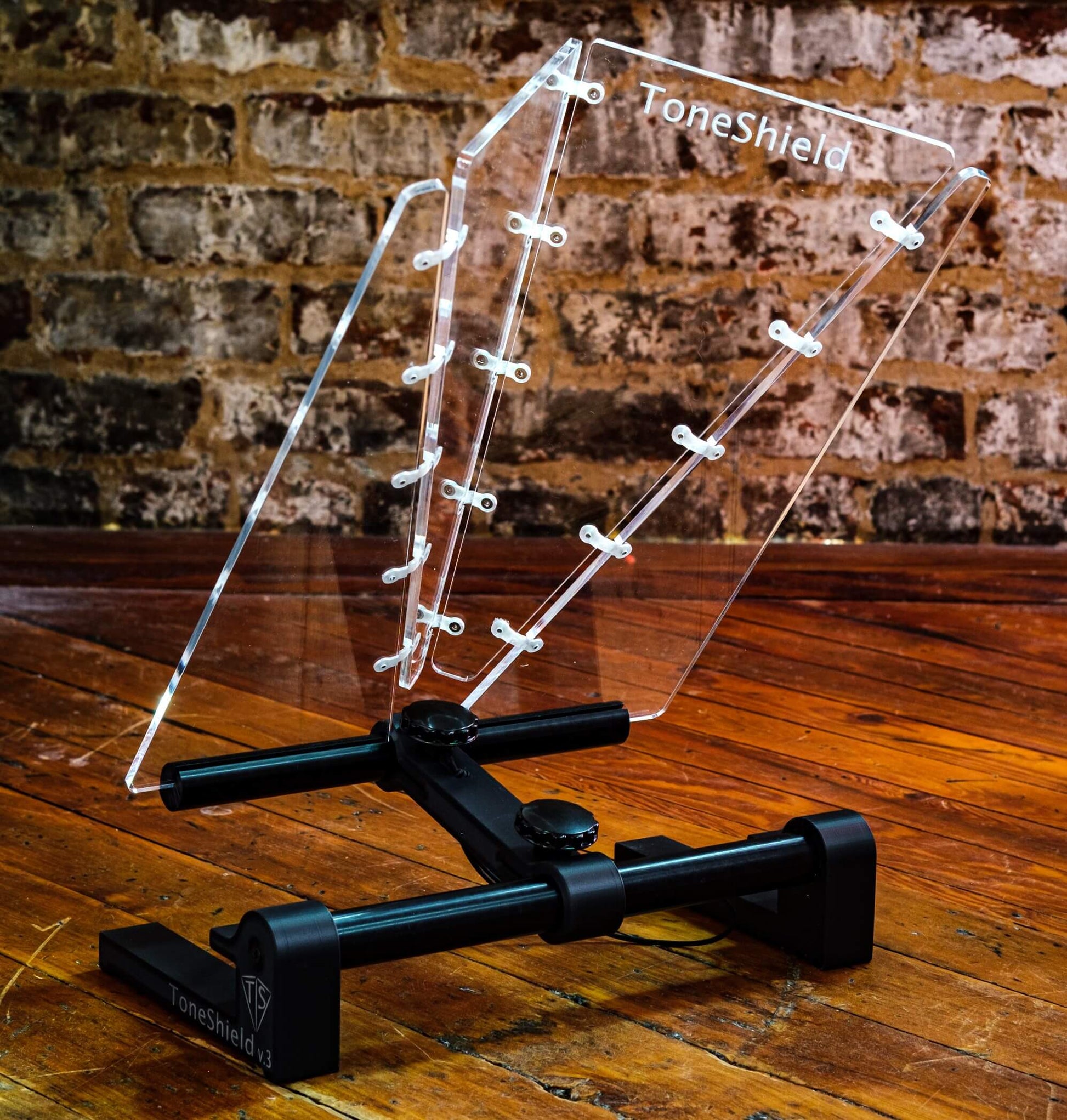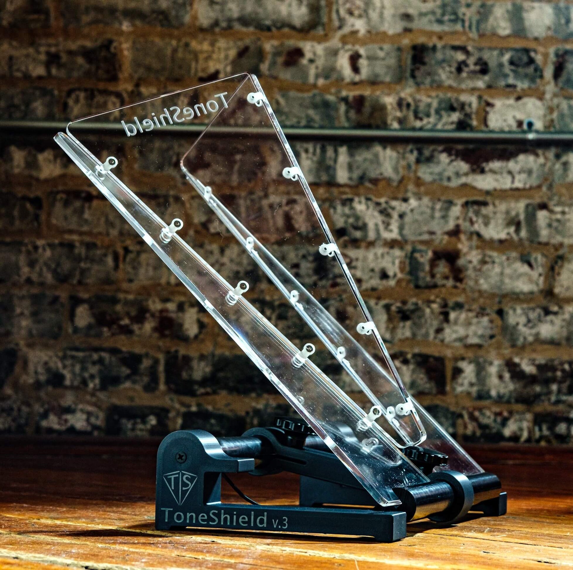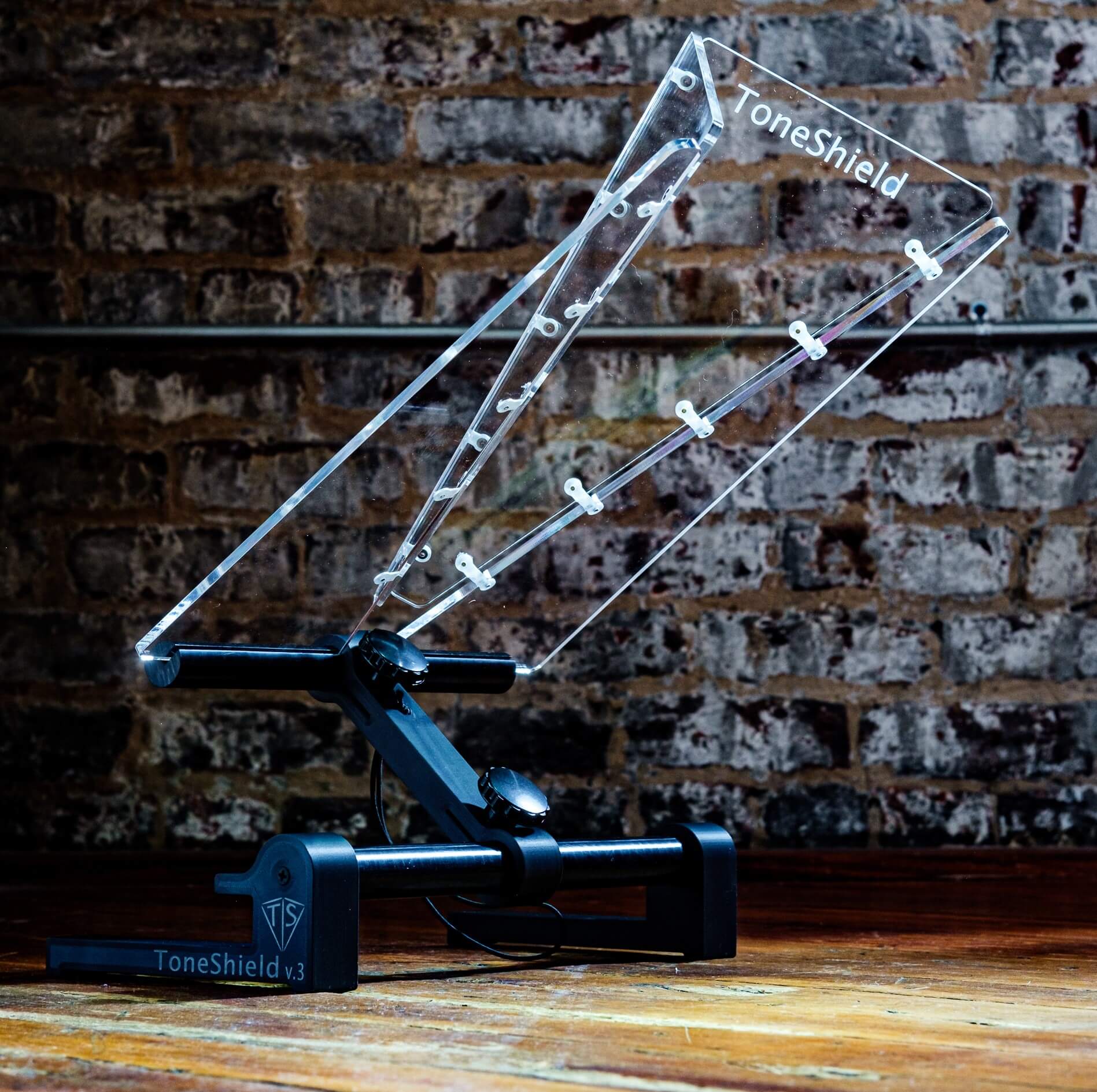 ToneShield v3 including new hinge design and adjustable base with unlimited angles and adjustable height from 1" up to 8". The adjustable ABS plastic base is lightweight, will adjust to any angle you desire and can be disassembled for compact travel. A new hinge design enables folding in either direction without damaging the hinges. Manufactured in Chatham, VA.