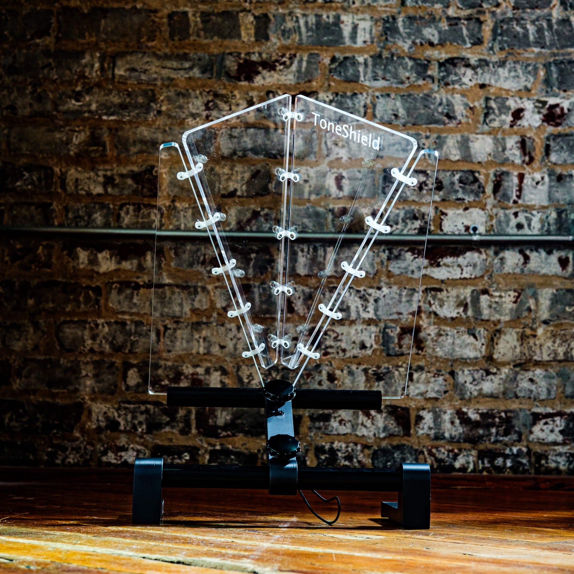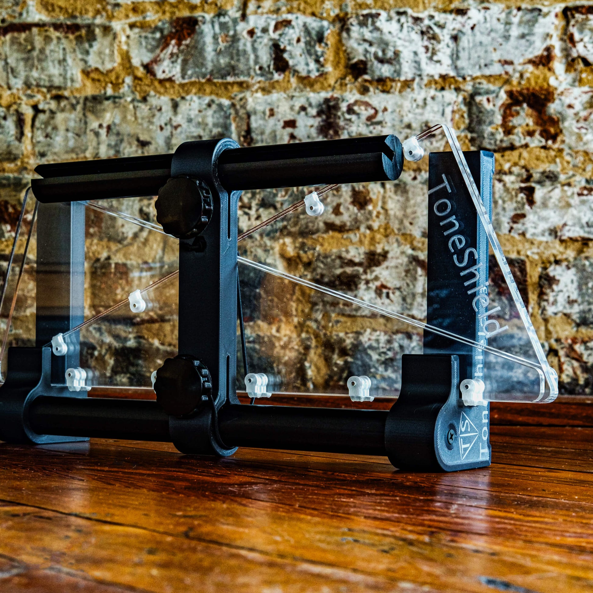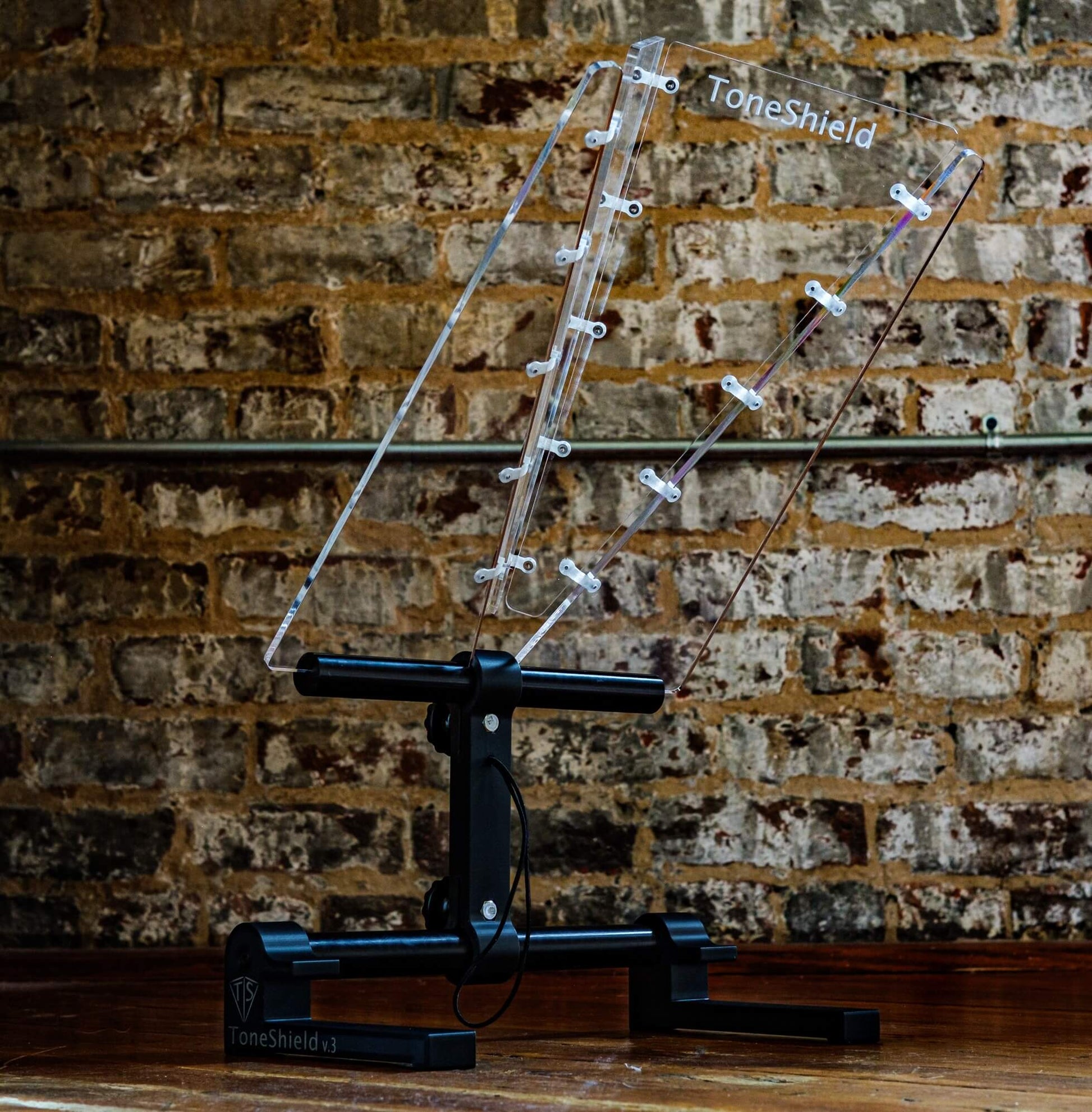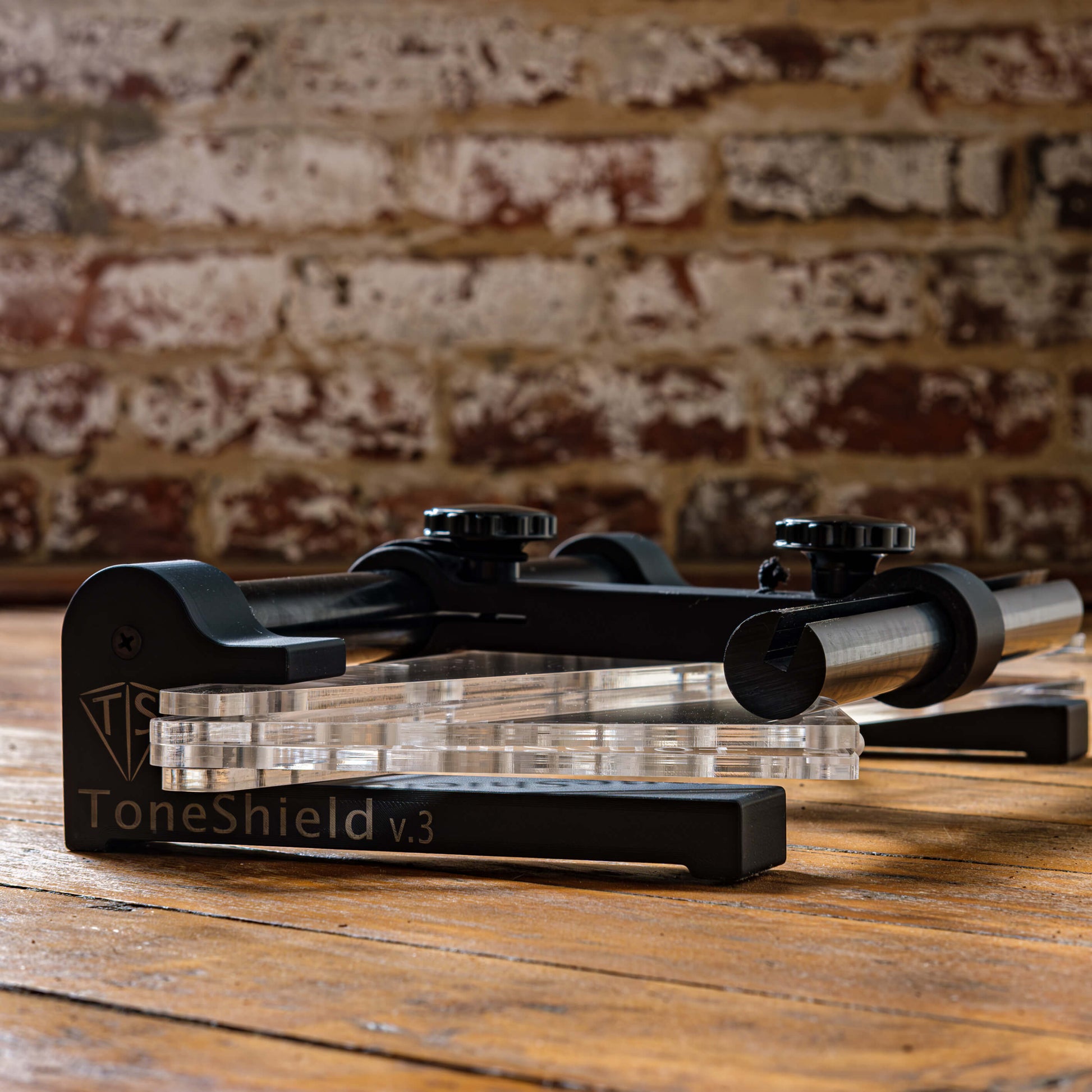 ToneShield v3 including new hinge design and adjustable base with unlimited angles and adjustable height from 1" up to 8". The adjustable ABS plastic base is lightweight, will adjust to any angle you desire and can be disassembled for compact travel. A new hinge design enables folding in either direction without damaging the hinges. Manufactured in Chatham, VA.