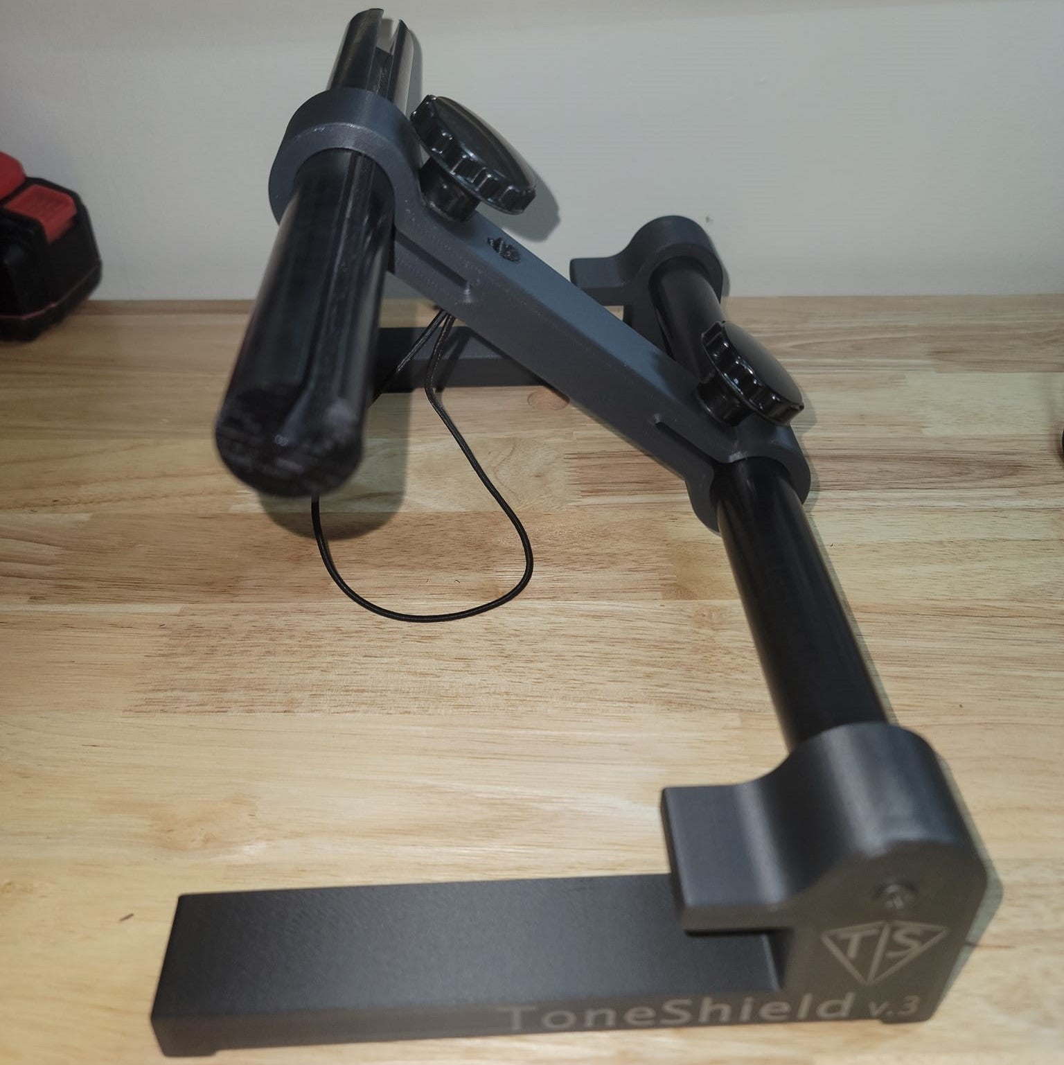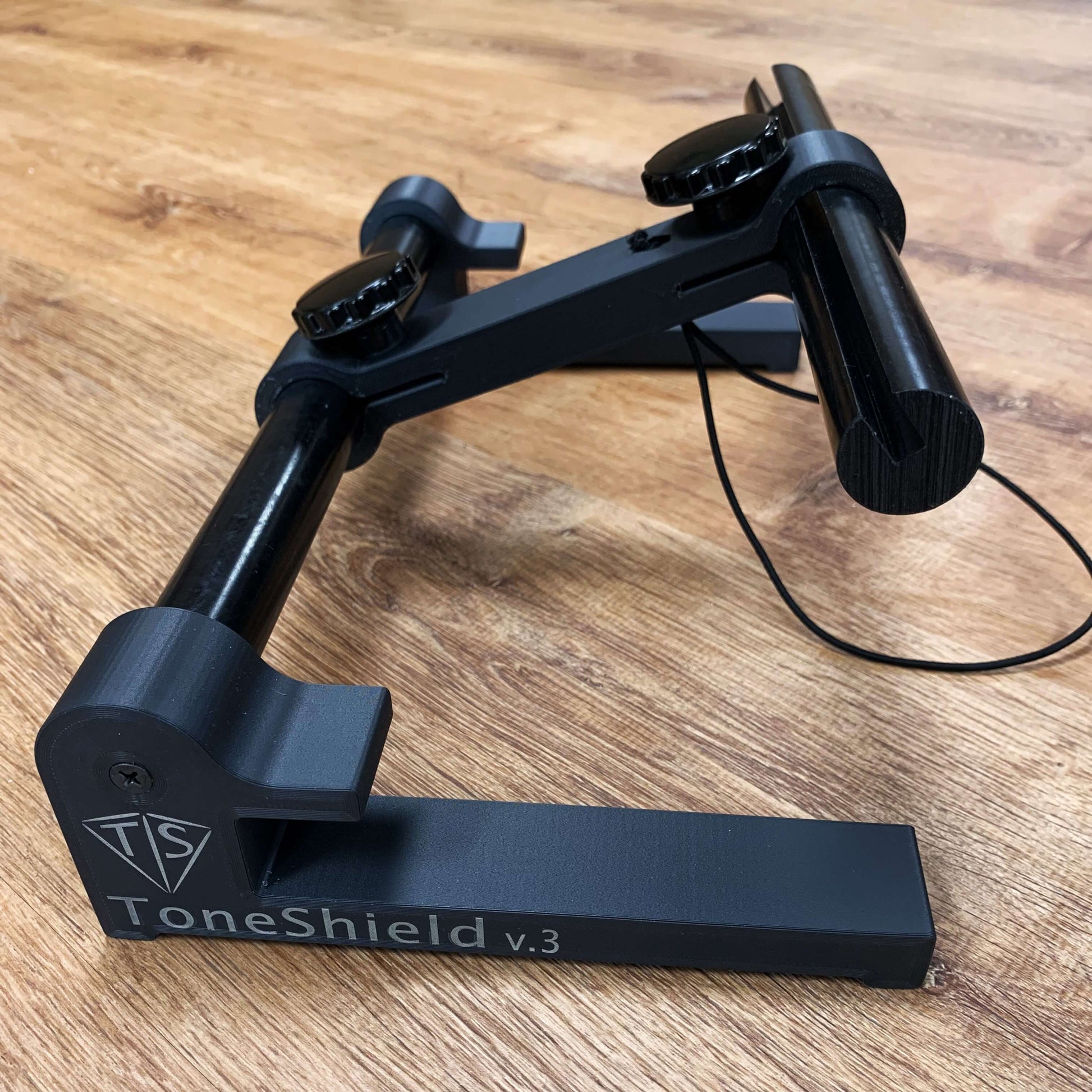 ToneShield v3 Base is lightweight, will adjust to any angle you desire at heights of 1" to 8" and can be disassembled for compact travel. Base only - the Shield is not included. Works with version 3 Shield and will work with previous shield versions but with some limitations. Previous Shield models must be modified to work with this base without any limitations. Please reach out if you're interested in modifying your shield to use with this base. The modification will not affect the shield working with earlier version bases. Manufactured from ABS in Chatham, VA.